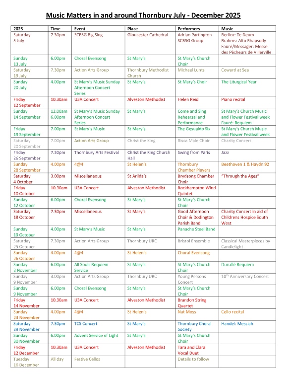Here is a list of classical concerts in and around Thornbury for the next 6 months.
